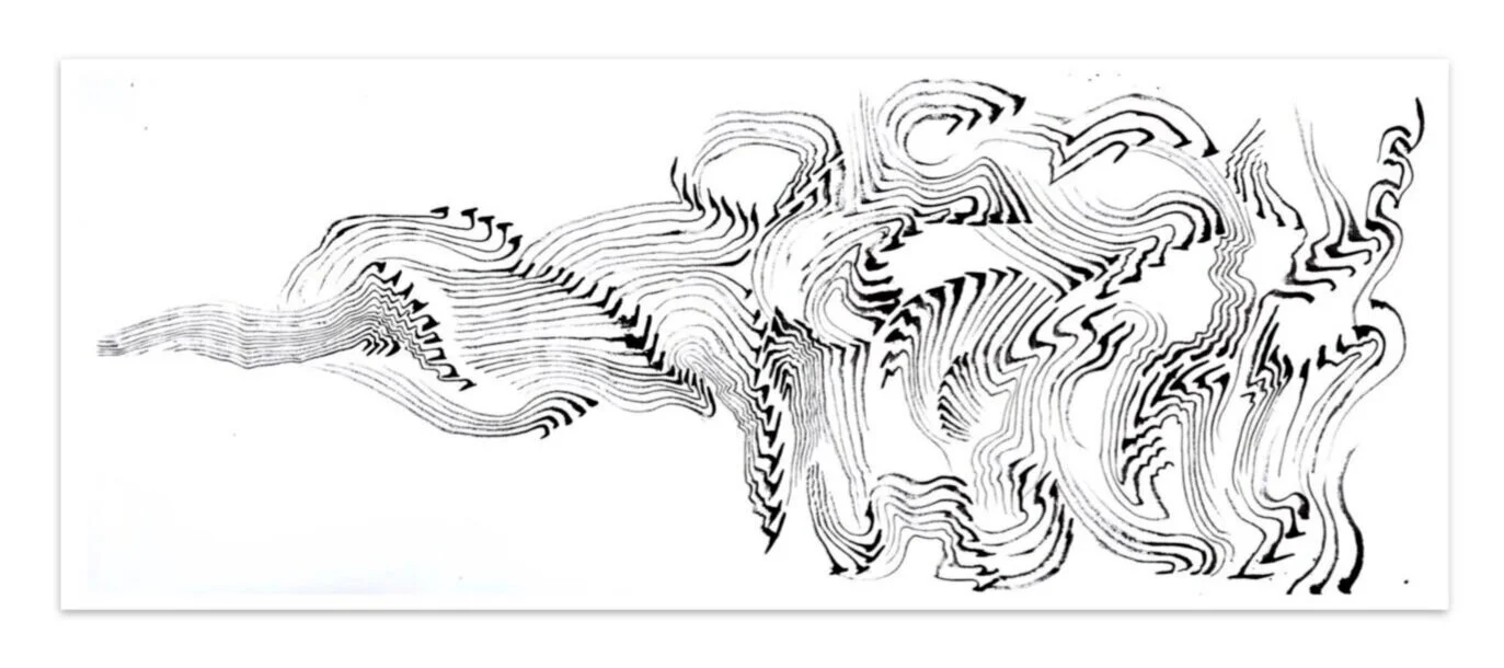 Currents – black ink on recycled door shade; 76” X 31”