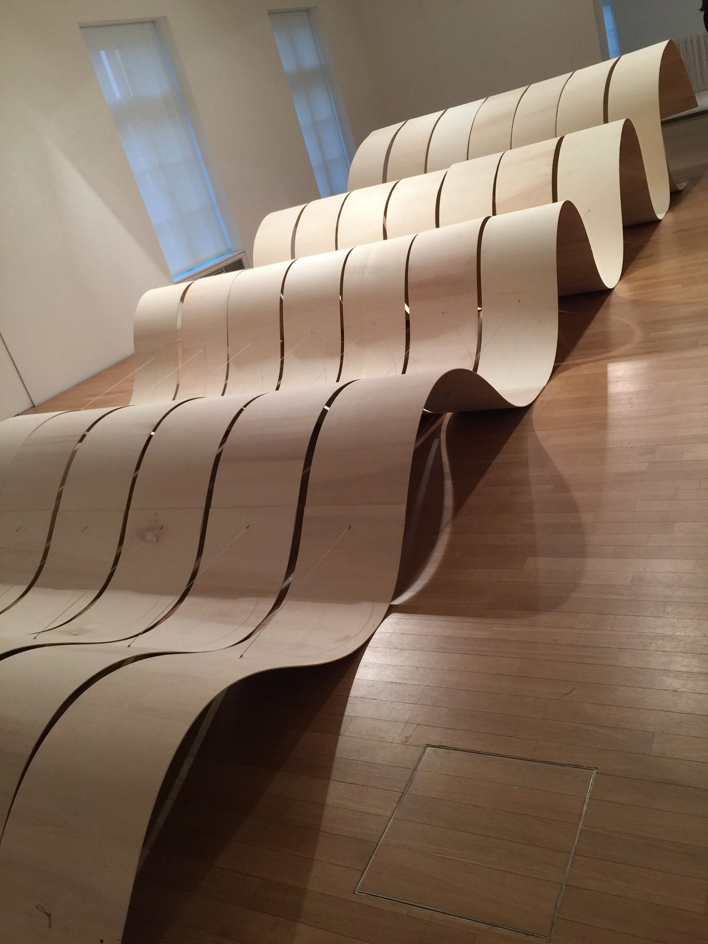 Returning to his early principle of creating something original for museum spaces, he created these installations using simple materials: rocks (left over from the previous exhibit), plywood, cables, metal rods, string, tar paper, Christmas lights, and chopsticks.